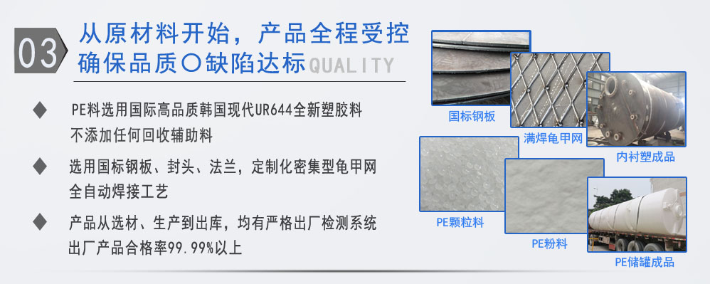 公司有鋼襯塑PE/PO、PE全塑、碳鋼、不銹鋼四大系列100多個(gè)品種,專注于常壓儲存容器生產(chǎn),其產(chǎn)品包括鋼襯塑儲罐、管口一體成型PE儲罐、碳鋼儲罐、不銹鋼儲罐、反應(yīng)釜、攪拌罐、離子交換柱、鋼襯PE/PO儲罐、塑料儲罐、鹽酸儲罐、硫酸儲罐等等。更大限度滿足廣大客戶的各種需求,同時(shí)可以根據(jù)客戶的需要加工定制各種防腐設(shè)備。